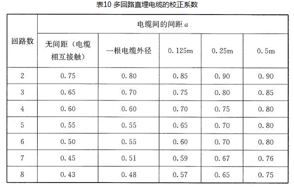 直埋电缆多于一回路,当土壤热阻系数高于2.5K·m/w时,应适当降低载流量或更换电缆周围的土壤。多回路直埋电缆的载流量校正系数,应按《低压电气装置第5-52部分:电气设备的选择和安装布线系统》GB/T16895.6-2014表B.52.18的规定进行选取,见表10。