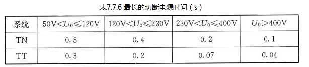 对于交流配电系统中不超过32A的终端回路,其故障防护最长的切断电源时间不应大于表7.7.6的规定。
