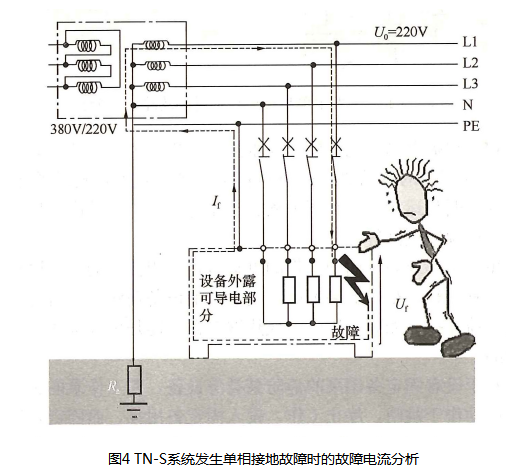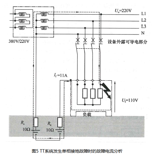 水泵房一般由专业人员进入,发生直接接触电击的可能性极小,安全防护的重点是防止间接接触电击防护(故障防护)。对于常见的TN和TT系统,参见图4和图5故障电流分析图,可以发现,对于TN系统而言,单相接地故障电流通常较大,利用保护电器的短路保护可以兼作接地故障保护,但需要对故障电流I进行验证,避免发生故障电流过小短路保护无法动作的情况;对于TT系统,单相接地故障电流较小(数安培),需要加装RCD来进行故障保护,考虑到兼顾电气火灾防护的功能,故在此规定选用灵敏度为300mA的剩余电流保护器进行防止间接接触电击防护(故障防护)。