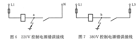 如图6所示,当a点发生对大地短路时,电气通路为:L1—熔断器—接触器线圈—a点—大地,因此,接触器线圈带电,造成电动机不能停车,或电动机意外启动。图7控制电源为380V,如果b点发生短路,L1—熔断器—接触器线圈—b点—大地构成电气通路,结果是电动机不能停车或意外启动。因此,图6和图7都是不可靠的控制接线方案,设计时应引起注意。