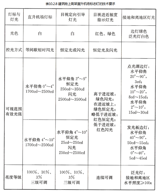 在建筑物顶部设置高架直升机场时,应装设直升机场灯标、目视定向引导灯光系统、目视进近坡度指示灯、接地和离地区灯光系统等,并应符合表10.2.8的规定。