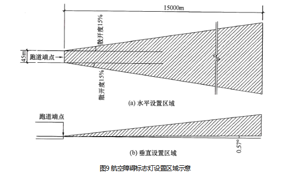 自机场跑道中点起、沿跑道延长线双向各15km、两侧散开度各15%的区域内,顶部与跑道端点连线与水平面夹角大于0.57°的建筑物或构筑物应装设航空障碍标志灯,并应符合相关规范的要求。