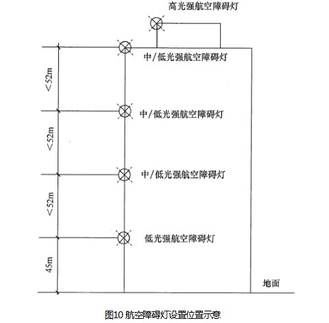 航空障碍标志灯的水平安装间距不宜大于52m;垂直安装自地面以上45m起,以不大于52m的等间距布置。