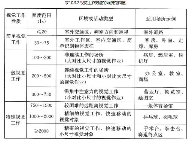 10.3.2 各类视觉工作对应的照度范围宜按表10.3.2选取。