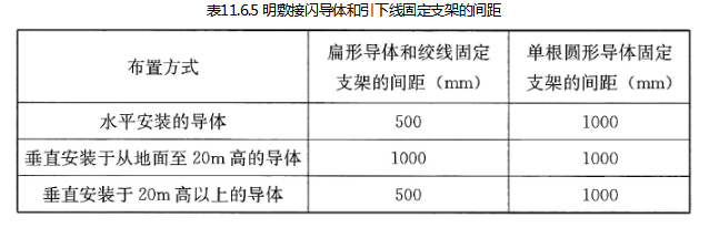 明敷接闪导体和引下线支架的间距不宜大于表11.6.5的规定,固定支架的高度不宜小于150mm。