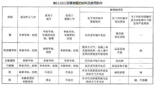 防雷装置使用的材料及其应用条件宜符合表11.10.1的规定。