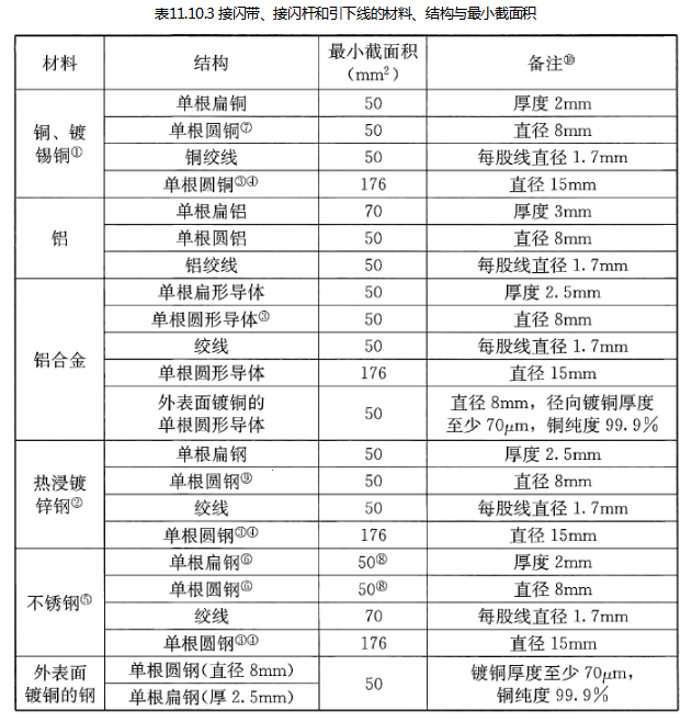 接闪带、接闪杆和引下线的材料、结构和最小截面积应符合表11.10.3的规定。