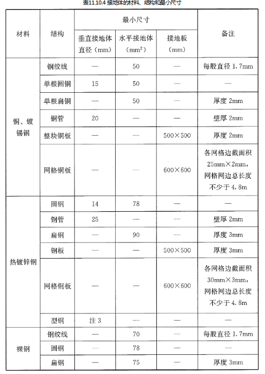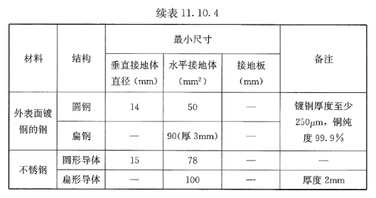 接地体的材料、结构和最小截面积应符合表11.10.4的规定。