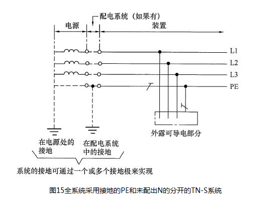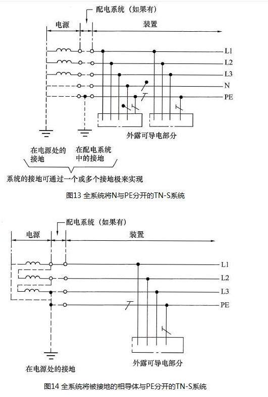 TN-S系统,整个系统应全部采用单独的PE,电气装置的PE也可另外增设接地(图13~图15)。