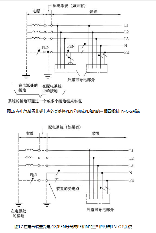 2)TN-C-S系统,系统中的一部分,N的功能和PE的功能合并在一根导体中(图16~图18)。图16中电气装置的PEN或PE导体可另外增设接地。图17和图18中对配电系统的PEN和装置的PE也可另外增设接地。