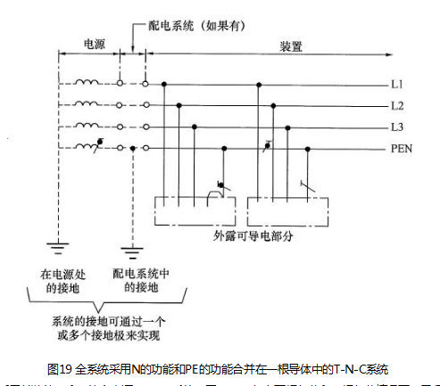 3)TN-C系统,在全系统中,N的功能和PE的功能合并在一根导体中(图19)。电气装置的PEN也可另外增设接地。