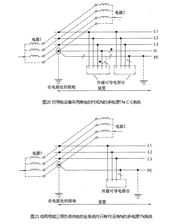 对用电设备采用单独的PE和N的多电源TN-C-S系统(图20),仅有两相负荷和三相负荷情况下,无须配出N和PE宜多处接地。具有多电源的TN系统(图21),应避免工作电流流过不期望的路径。
