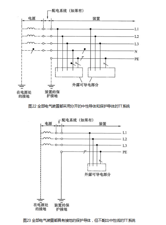 TT系统应只有一点直接接地,电气装置的外露可导电部分应接到电气上独立于电源系统接地的接地极上(图22和图23),对电气装置的PE可另外增设接地。