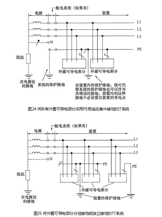 IT电源系统的所有带电部分应与地隔离,或某一点通过阻抗接地(图24和图25)。对电气装置的PE可另外增设接地,并应符合下列要求: