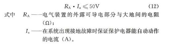 系统中所装设的用于故障防护的保护电器的特性和电气装置外露可导电部分与大地间的电阻值应满足公式(12)要求: