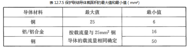 12.7.5 接到总接地端子的保护联结导体的截面积不应小于电气装置内的最大保护接地导体(PE)截面积的一半,保护联结导体截面积的最大值和最小值应符合表 12.7.5 的规定。