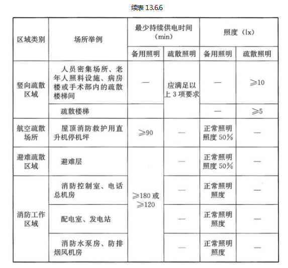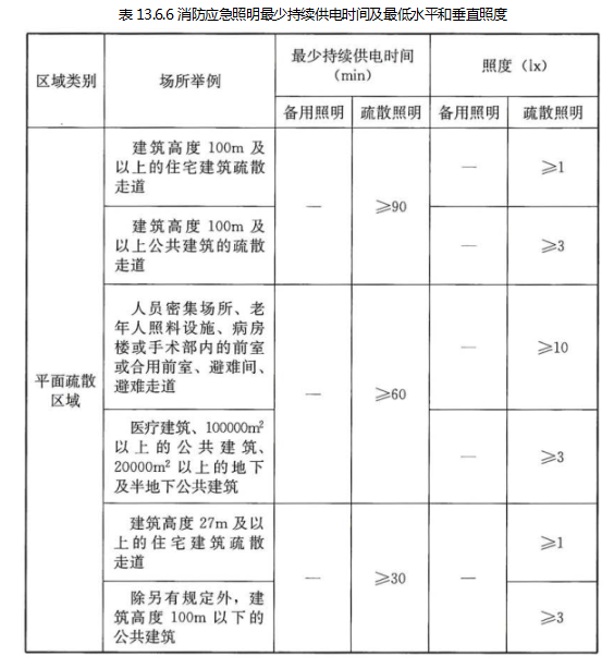 备用照明及疏散照明的最少持续供电时间及最低照度,应符合表13.6.6 的规定 。