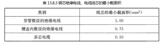 火灾自动报警系统传输线路的线芯截面积选择,除应满足自动报警装置技术条件的要求外,尚应满足机械强度的要求,电线、电缆的最小截面积不应小于表13.8.3的规定。