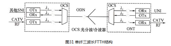 1)当FTTH必须利用承载HFC平台HFC下行光信号的一芯光纤实现人户时,系统应采用单纤三波长波分复用方式构建(图31)。采用单纤三波长波分复用方186式时,应考虑光信号的受激拉曼散射(SRSC)效应对传输性能的影响。