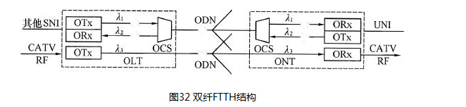 光纤到户(FTTH)是为了给用户提供高速双向的业务服务,下行信号除了传递模拟和数字有线广播电视信号,还应传递互联网、物联网、云端的信号;上行信号除了电视节目点播等,还可传输其他语音、图像、视频、数字等信号。