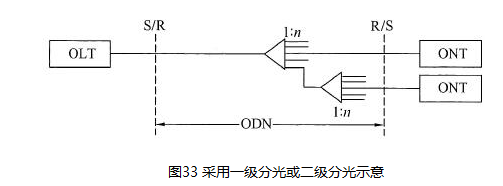 对于用户较多的建筑可采用两级无源分光,对于用户较少的建筑可采用一级无源分光,见图33。