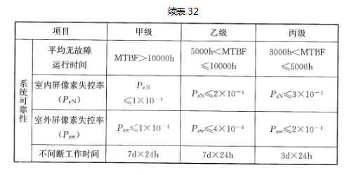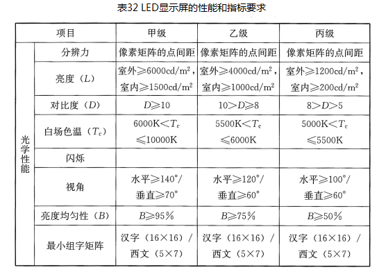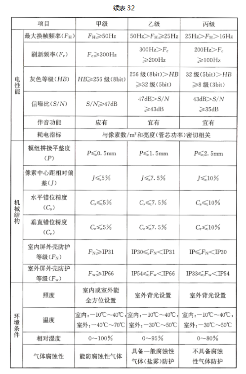 采用LED模组拼装矩阵显示装置时,设计宜对显示装置按表32的分级性能,提出部分或全部技术要求。