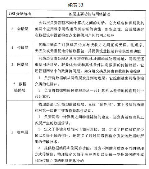 1) OSI参考模型是网络最基本的规范,其描述见表33。