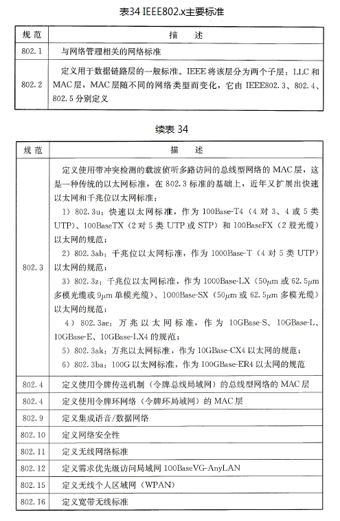 2) IEEE802.x主要标准参见表34。