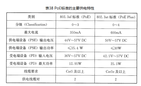 Ethernet,指在现有以太网五类线布线架构下,能够通过网线为远端符合规范的受电终端提供电力的网络交换机。传统远端受电终端为无线AP、网络摄像机和IP电话机等。PoE标准的主要供电特性见表38。