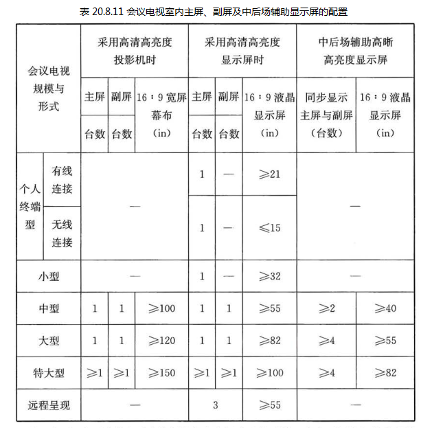 会议室内应按会场面积大小、参会人数和使用需求设置主/副屏投影机及投影幕布或主/副液晶显示屏设备,会场投影幕布或显示设备的布置应满足全场参会人员能处在良好的视距和视角范围内,其配置要求可按表
