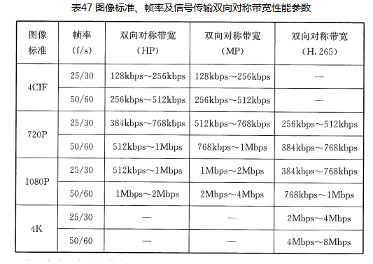 会议电视系统中H.239双码流协议图像标准、帧率及信号传输双向对称带宽宜满足表47的要求。
