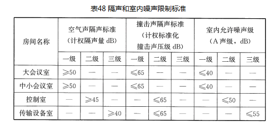 房间围护结构的隔墙与楼板的空气声、撞击声隔声标准以及室内允许噪声级见表48;