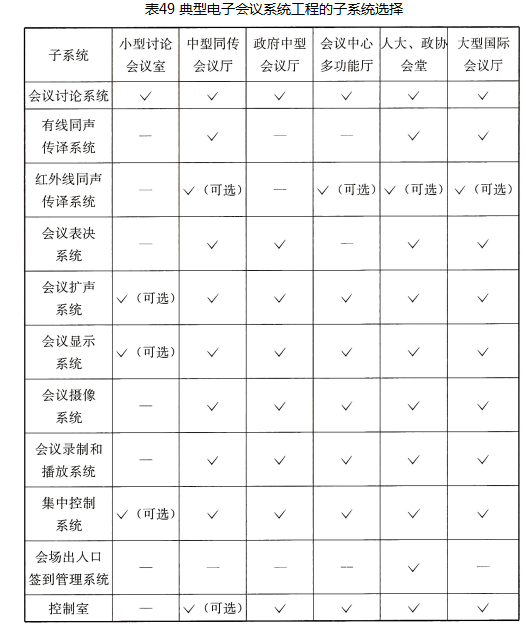根据会议厅堂规模和实际需求的不同,可选择不同的子系统,组合见表49。