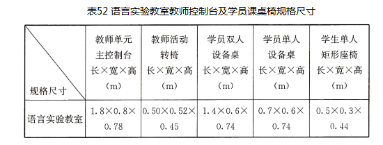 语言实验教室内学员单元应按标准的二座席学员单元设备桌规格位置和教师单元主控制台规格位置进行平面设置;教师单元主控制台宜采用钢板制作结构,学员单元设备课桌椅宜采用钢木结构,其规格尺寸可参见表52。