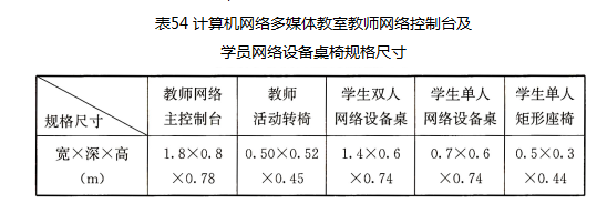 计算机网络多媒体教室平面布局设计、控制台及课桌椅规格尺寸等设备可参见表54的要求。