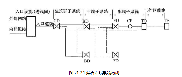 FD 可以经过主干线缆连至建筑群配线设备(CD) ,信息插座(TO) 也可以经过水平线缆连至