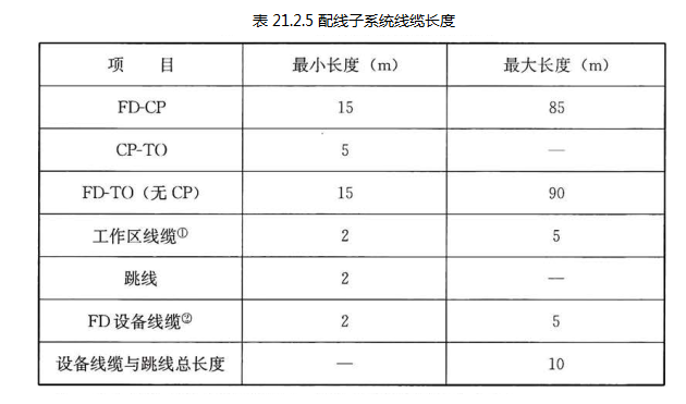 1 配线子系统信道的最大长度不应大于100m。各线缆应符合图21.2.5-1中线缆划分和表21.2.5中线缆长度的规定。