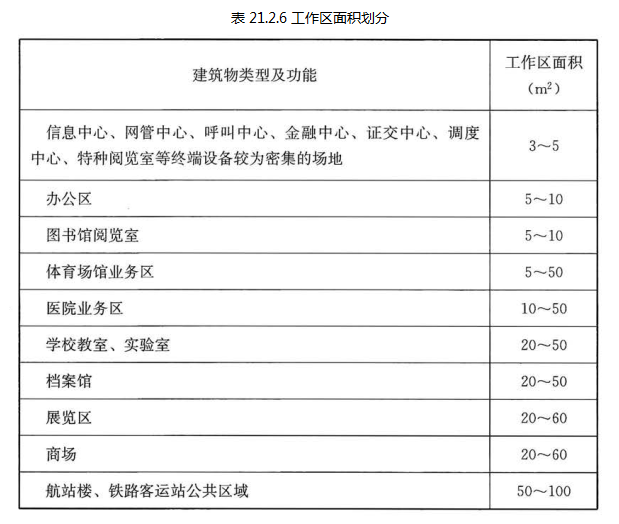 一个独立的需要设置终端设备(TE)的区域宜划分为一个工作区。工作区面积的划分,应根据不同建筑物的功能和应用,并作具体分析后确定。当终端设备需求不明确时,工作区面积宜符合表