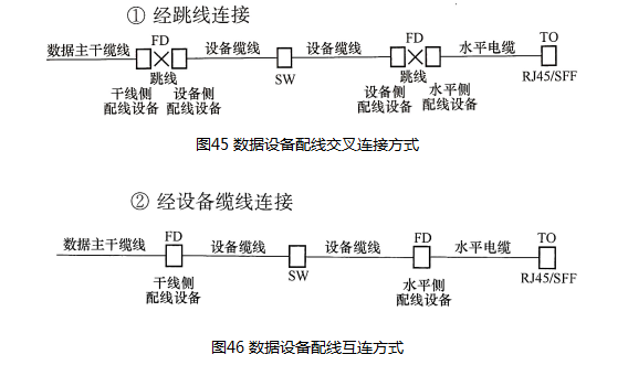 CD)的干线侧配线设备与水平侧配线设备之间,电话交换系统配线采用跳线连接方式;计算机网络设备配线的数据主干线缆与网络交换机之间、网络交换机与水平线缆之间,可采用楼层配线设备跳线交叉连接或不经楼层配线设备跳线,而采用设备线缆直接连接。