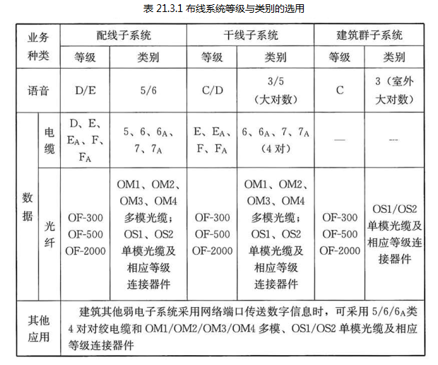 在表21.3.1中,其他应用一栏应根据系统对网络的构成、传输线缆的规格、传输距离、接口方式等要求选用相应等级的综合布线产品。