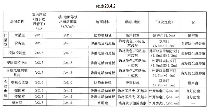 各类机房的室内净高、荷载及地面、门窗等要求,应符合表23.4.2的规定;