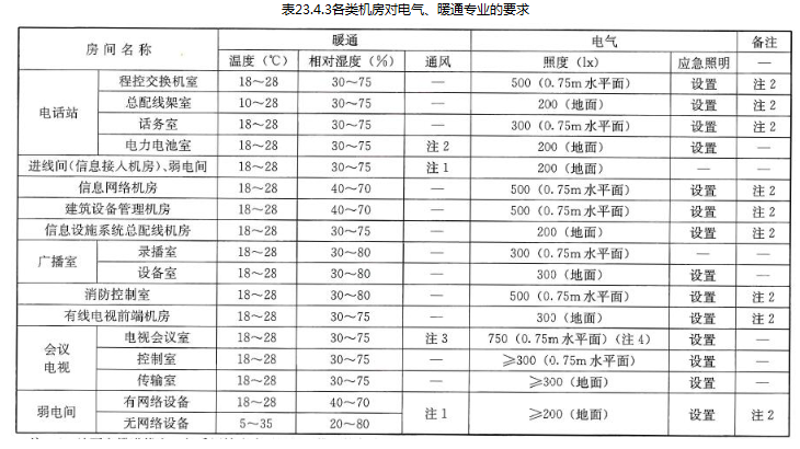 各类机房对电气、暖通专业的要求应符合表23.4.3的规定。