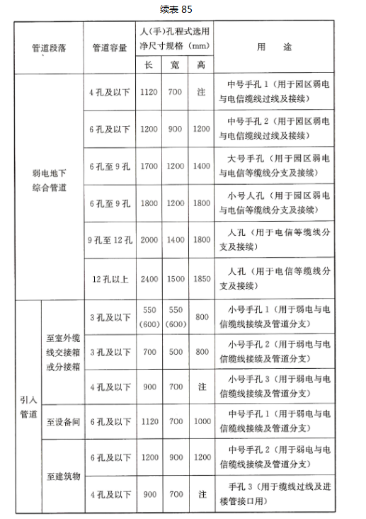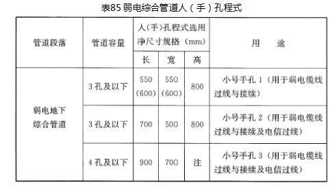 弱电综合管道人(手)孔程式应根据所在管段的用途及容量并按表85选择。