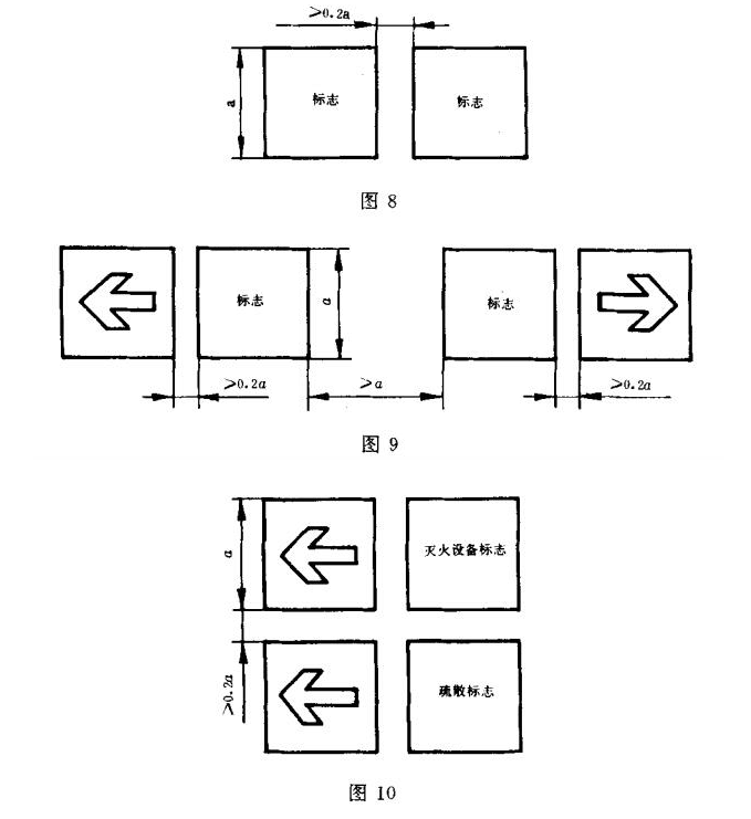 两个或更多的正方形消防安全标志一起设置时,各标志之间至少应留有标志公称尺寸0.2倍的间隙,如图8所示。