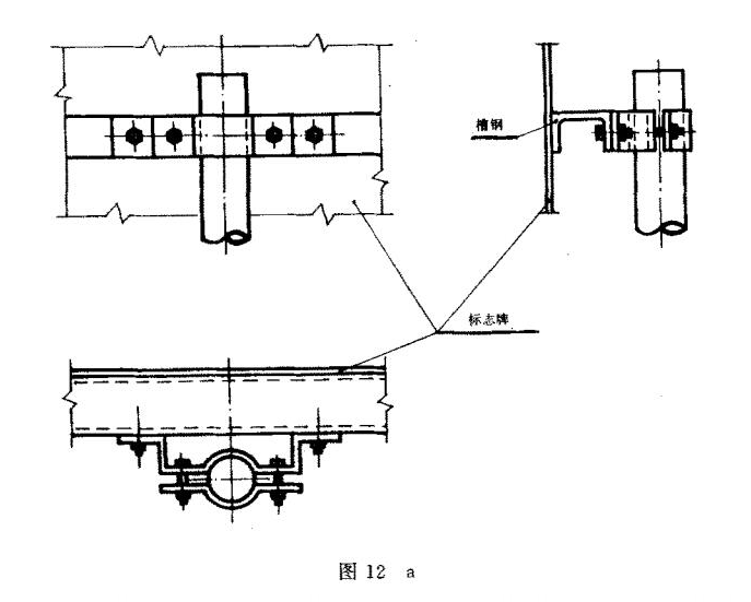 柱式设置的消防安全标志牌应用螺栓、管箍等牢固地固定在标志杆上。固定方法可参照图12进行。