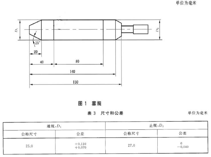 用塞规测量水带的内径。塞规用金属制成,如图1所示的结构,其尺寸和公差按表3规定,工作部分的表面粗糙度Ra为1.60。