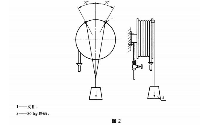 6.5.2 按6.5.1规定安装试样并灌水。如图2所示在卷盘侧板上悬挂质量为80 kg砝码。72