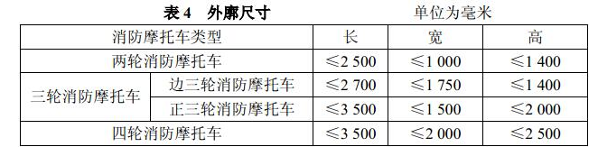 消防摩托车外廓尺寸的测定应按6.1.4进行,外廓尺寸应符合表4的规定。