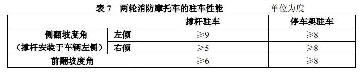 5.1.8.1 两轮消防摩托车侧翻坡度角、前翻坡度角的测定及抽拉消防软管试验应按6.1.7进行。两轮消防摩托车的驻车性能应符合表7的规定,抽拉消防软管时不得有侧倾翻倒现象出现。