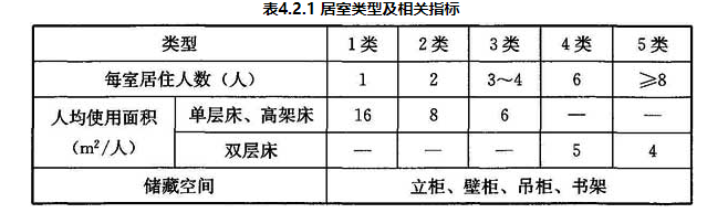 4.2.1 宿舍居室按其使用要求分为五类,各类居室的人均使用面积不宜小于表4.2.1的规定。